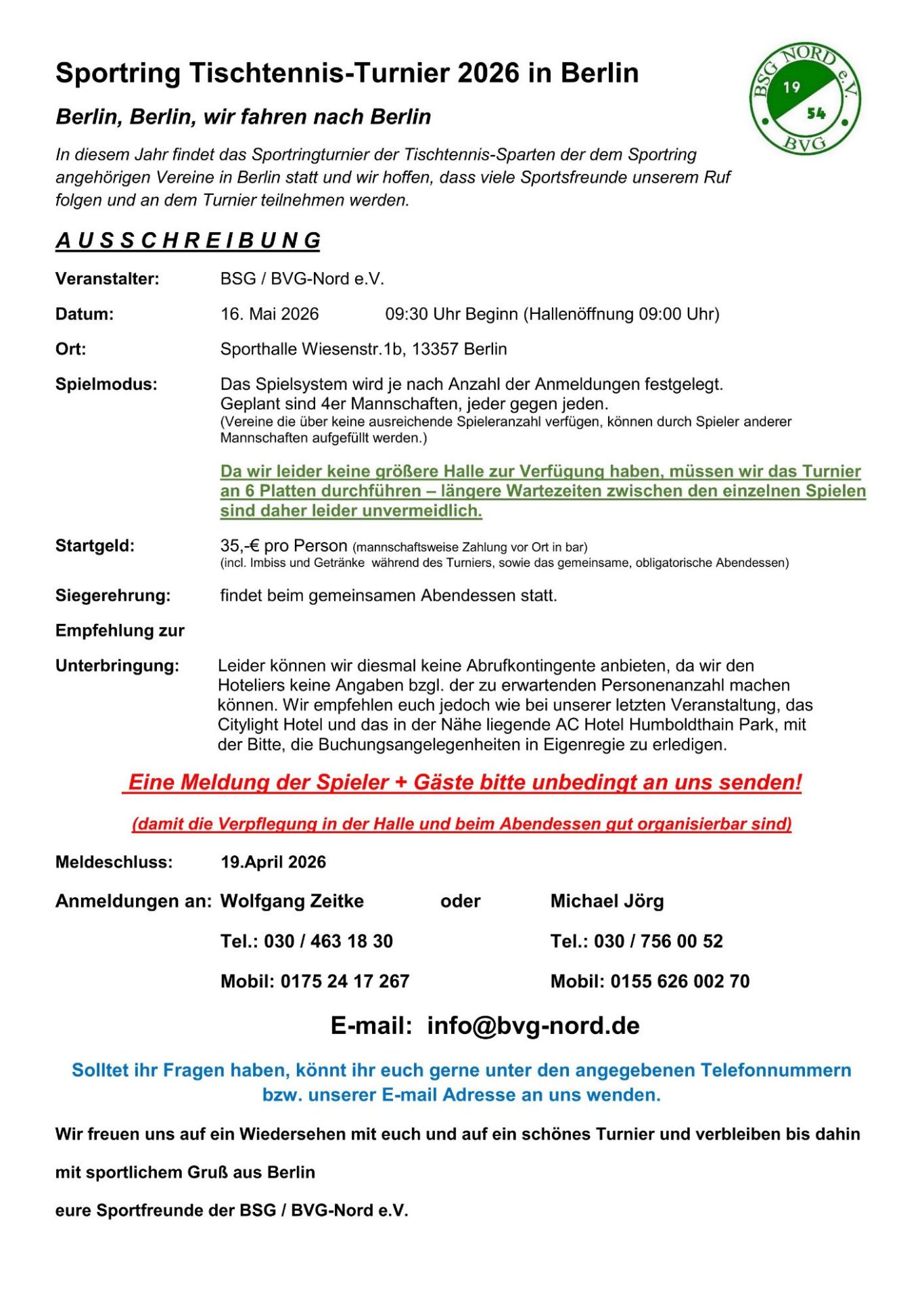 die BSG / BVG-Nord, sind Ausrichter und freuen uns schon jetzt auf unsere Sportsfreunde der