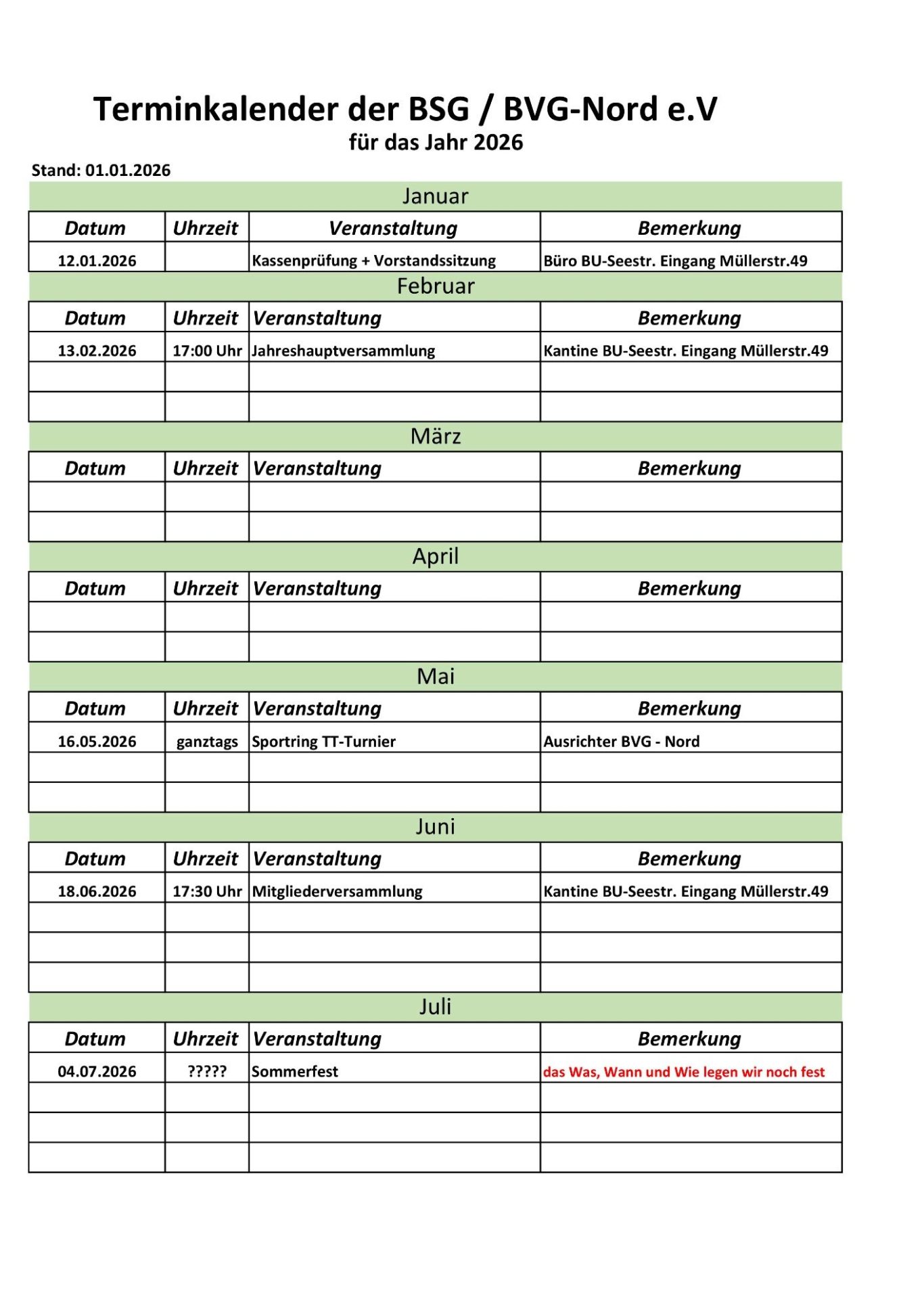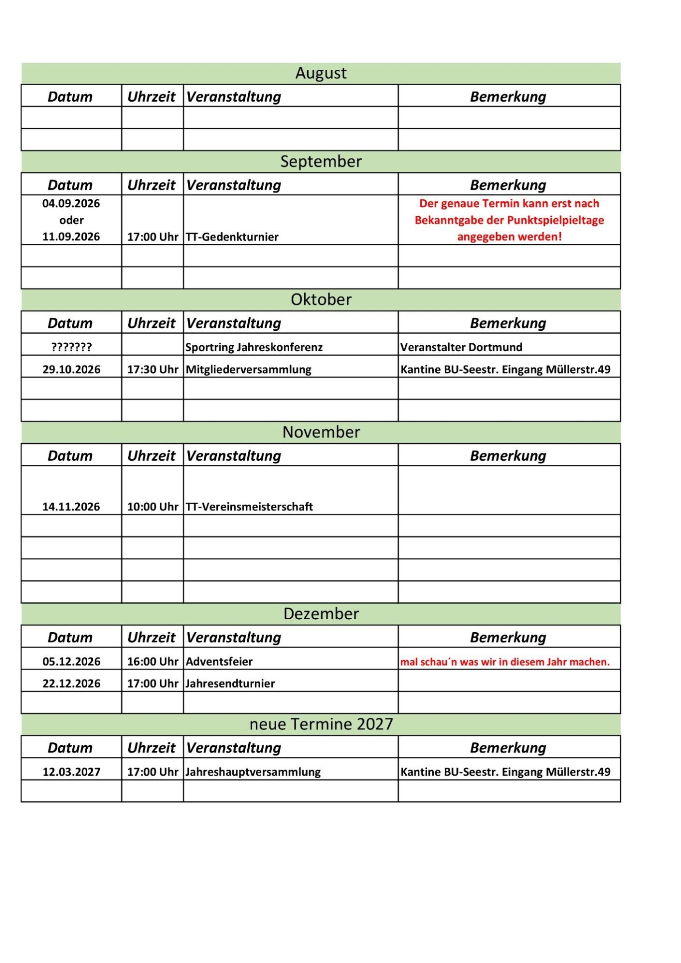 Unser Kalender beinhaltet alle geplanten Aktivitäten des Vereins. Hier kannst du dir einen Überblick verschaffen zu den nächsten Turnieren, Vereinsversammlungen und weiteren Zusammenkünften.